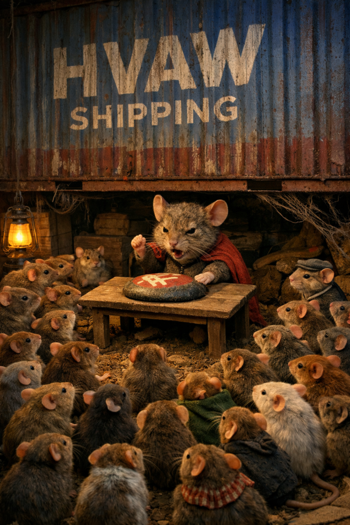 “Order! Order!” Magnus the mouse clapped his left paw hard onto the painted stone that decorated the Mouse Meeting Hall underneath the metal shipping container. He looked sternly at Mannie, the young mouse whose tail hung at an crooked angle, a remnant of his near miss with a shopping cart pushed by a drunken human late one night on the sidewalk. Mannie was still chattering to Mollie, the sweet young mouse whose mother Melanie had recently died inside one of the paper box traps in the gallery above.